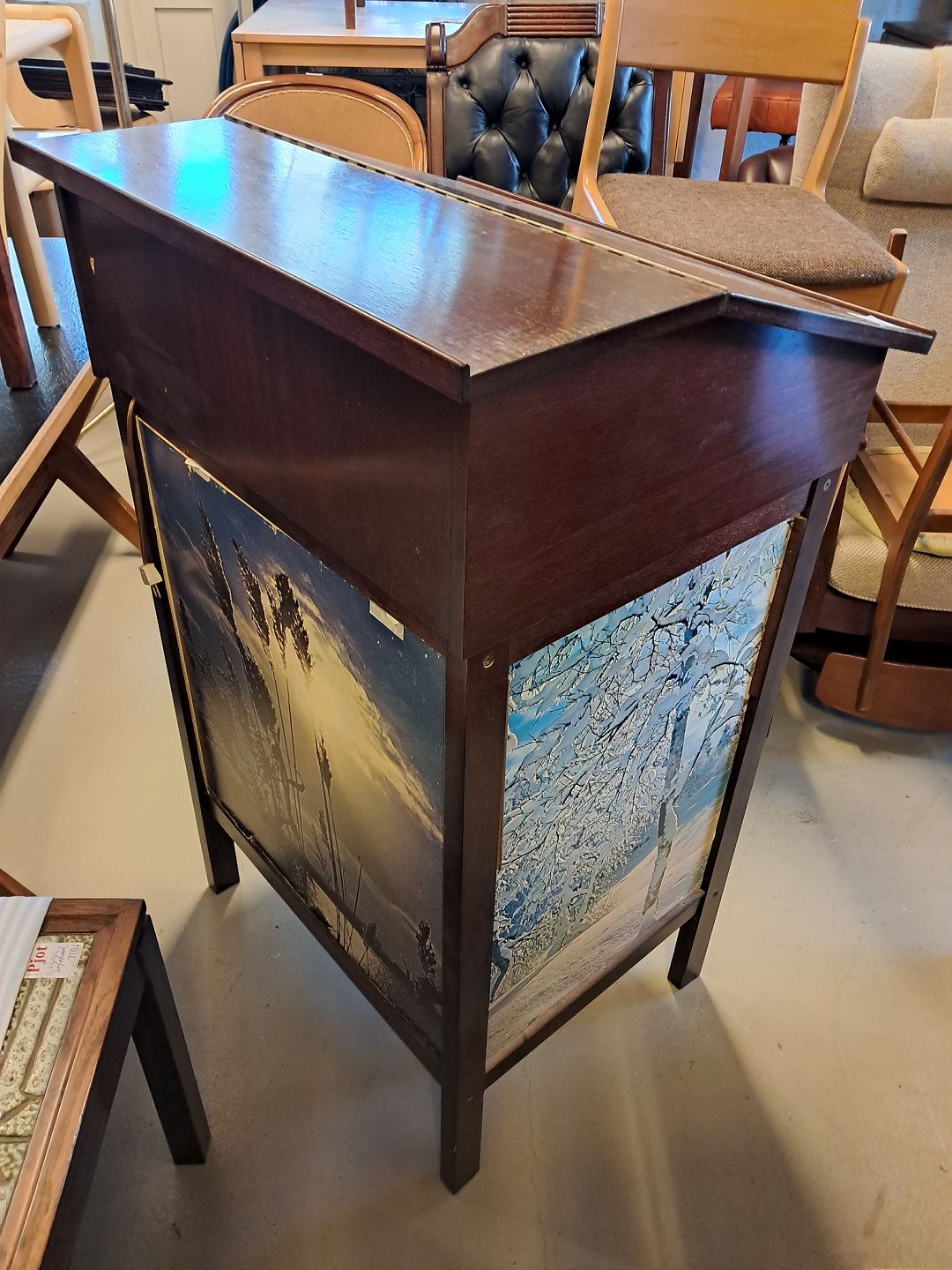 Skrivepult i fineret mahogni og glas, fra 1980erne. Den har brugsspor. Og der er glas på to af siderne. Højde 115cm Bredde 70cm Dybde 58cm Emne nummer: 77221