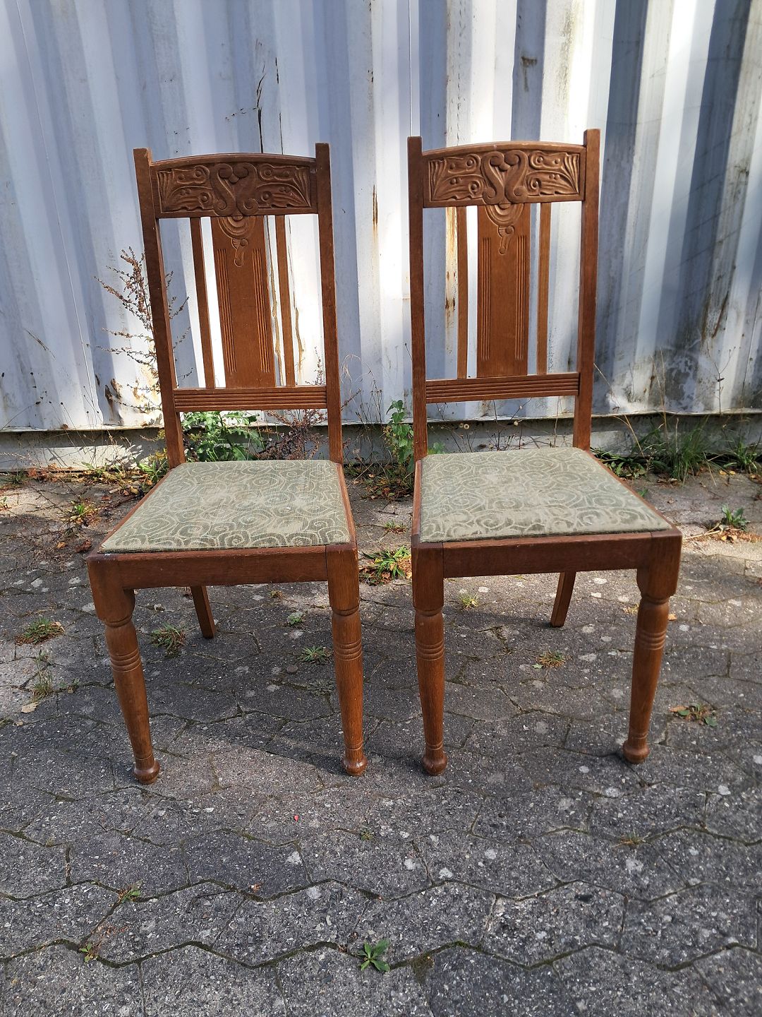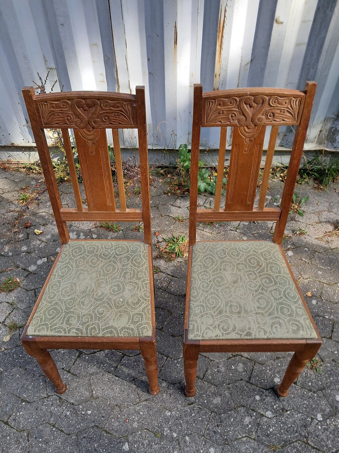2 Stole i massivt egetræ, fra 1910erne. De har bruggspor. Ryghøjde 105cm Sædehøjde 47cm Emne nummer: 77236