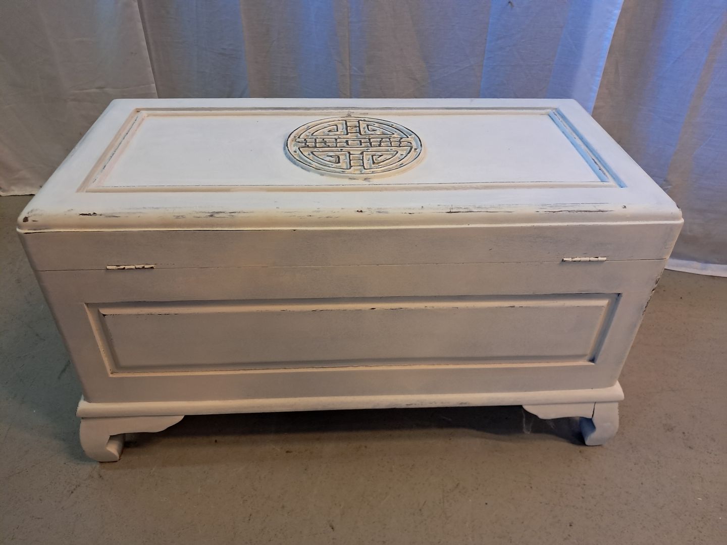 Malet kiste i kamfertræ, fra 1970erne.