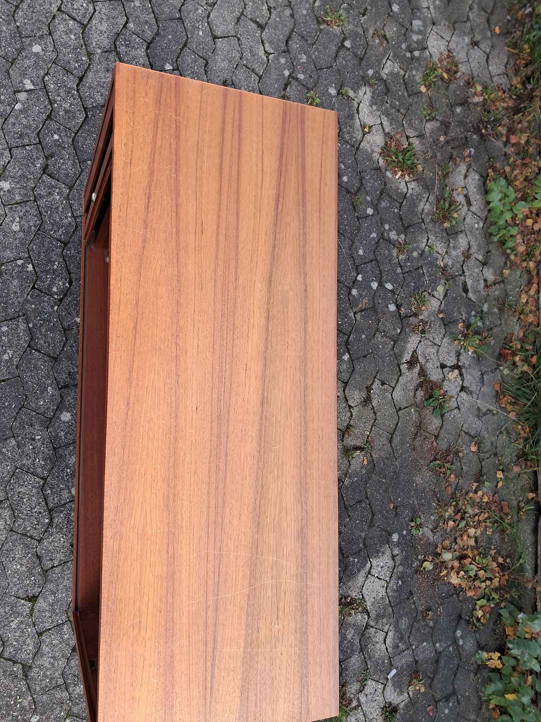 Jalousi skab i fineret teaktræ, fra 1970erne. Det har brugsspor og der medfølger ikke nøgle. Højde 93cm Bredde 120cm Dybde 43cm Emne nummer: 77345