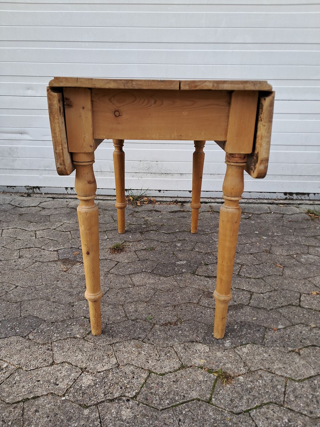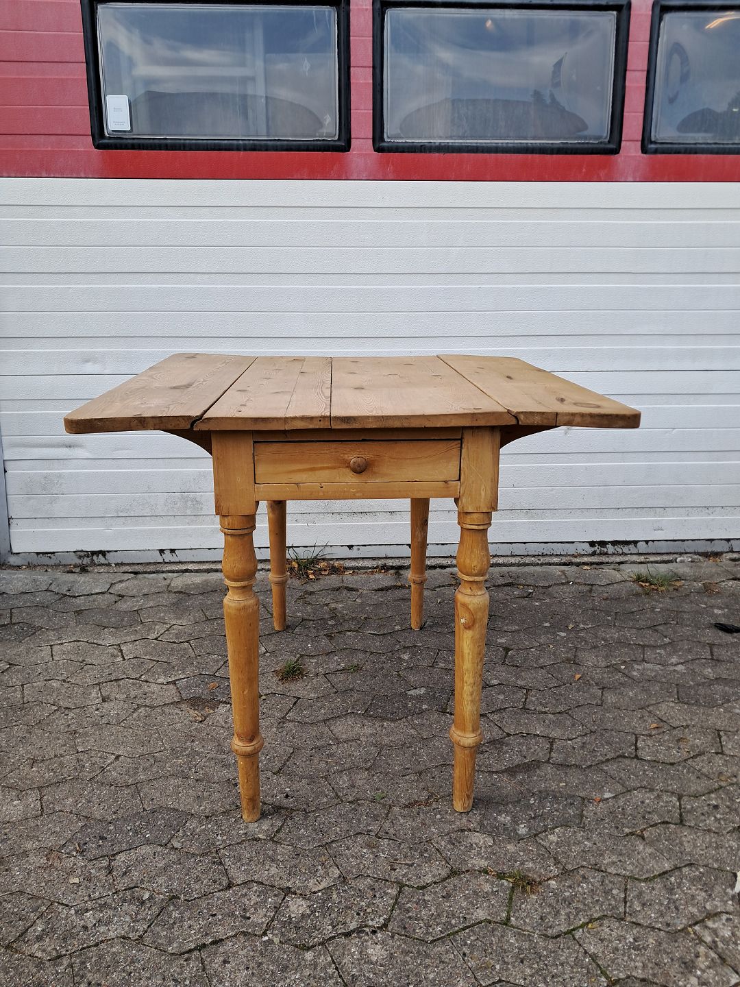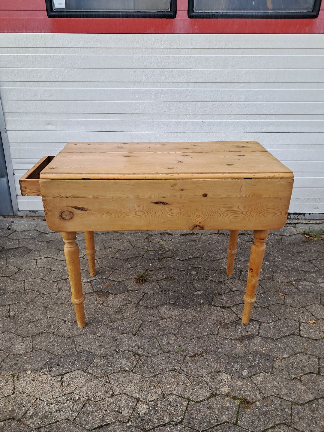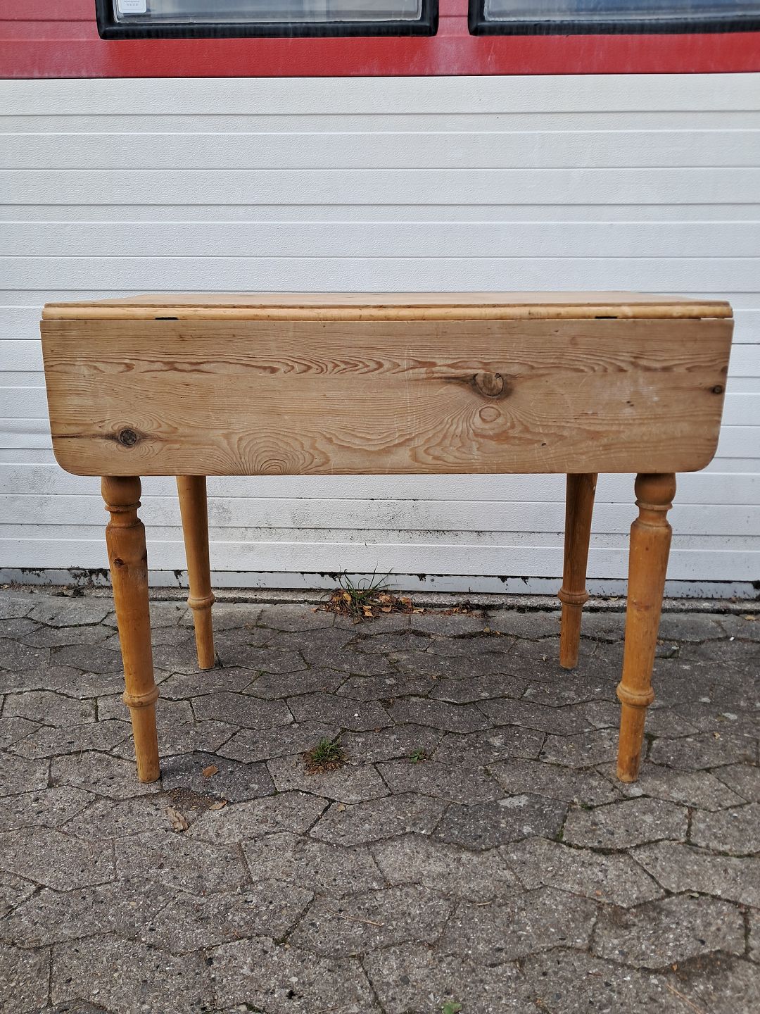 Bord i massivt fyrretræ med klapper og skuffe, fra 1920erne. Det har brugsspor. Højde 78cm Bredde 52cm Bredde med klapper 91cm Længde 94cm Emne nummer: 77350