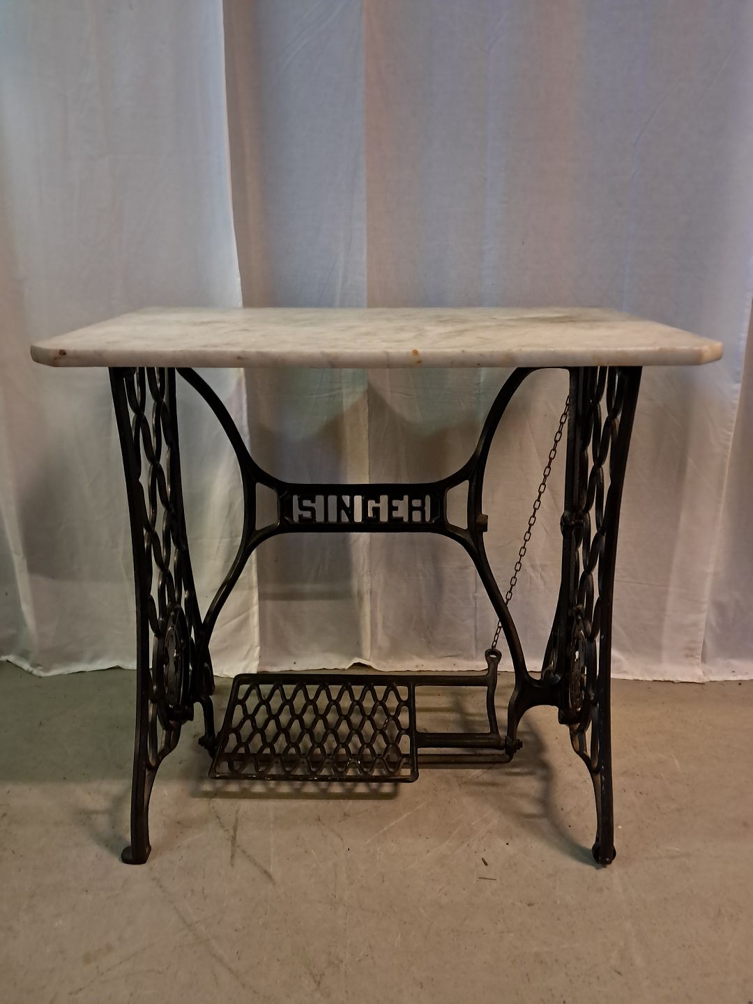 Singer symaskine-understel i metal med marmorplade, fra 1920erne. Det har brugsspor. Højde 74cm Bredde 75cm Dybde 52cm Emne nummer: 77456