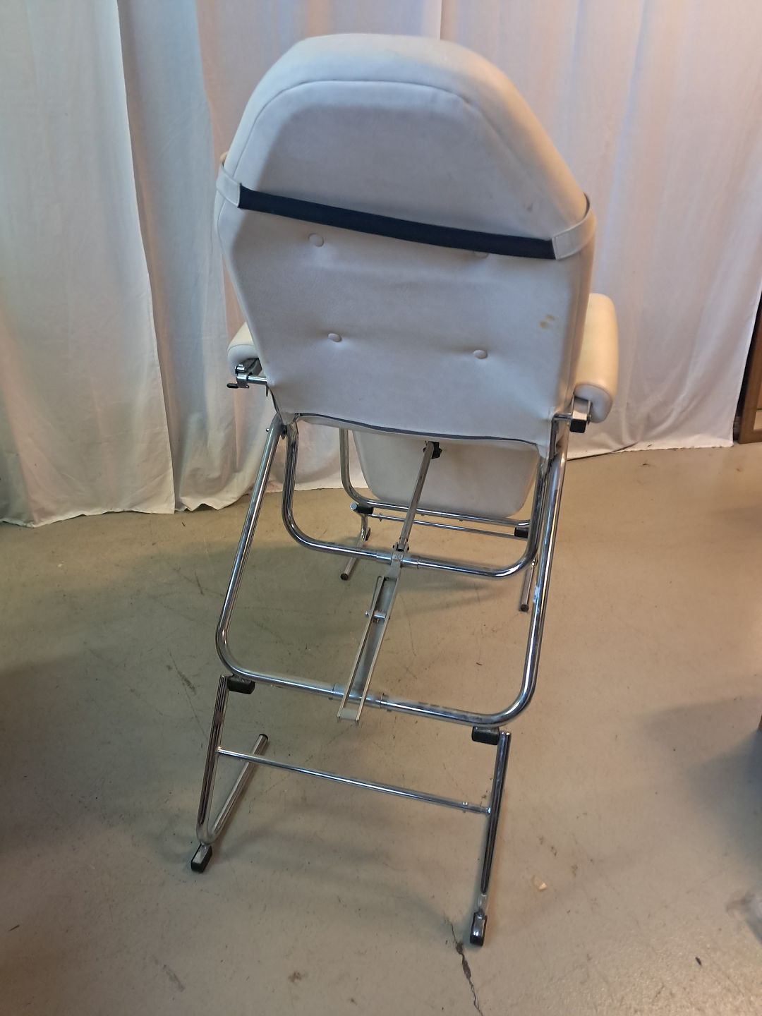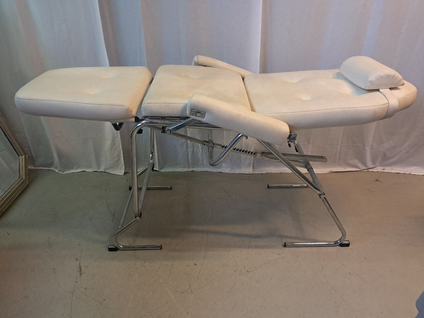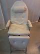 Massagse-stol og briks i metal og kunstlæder, fra 1990erne. Den har brugsspor. Højde 80cm Bredde 75cm Længde 165cm Emne nummer: 77462
