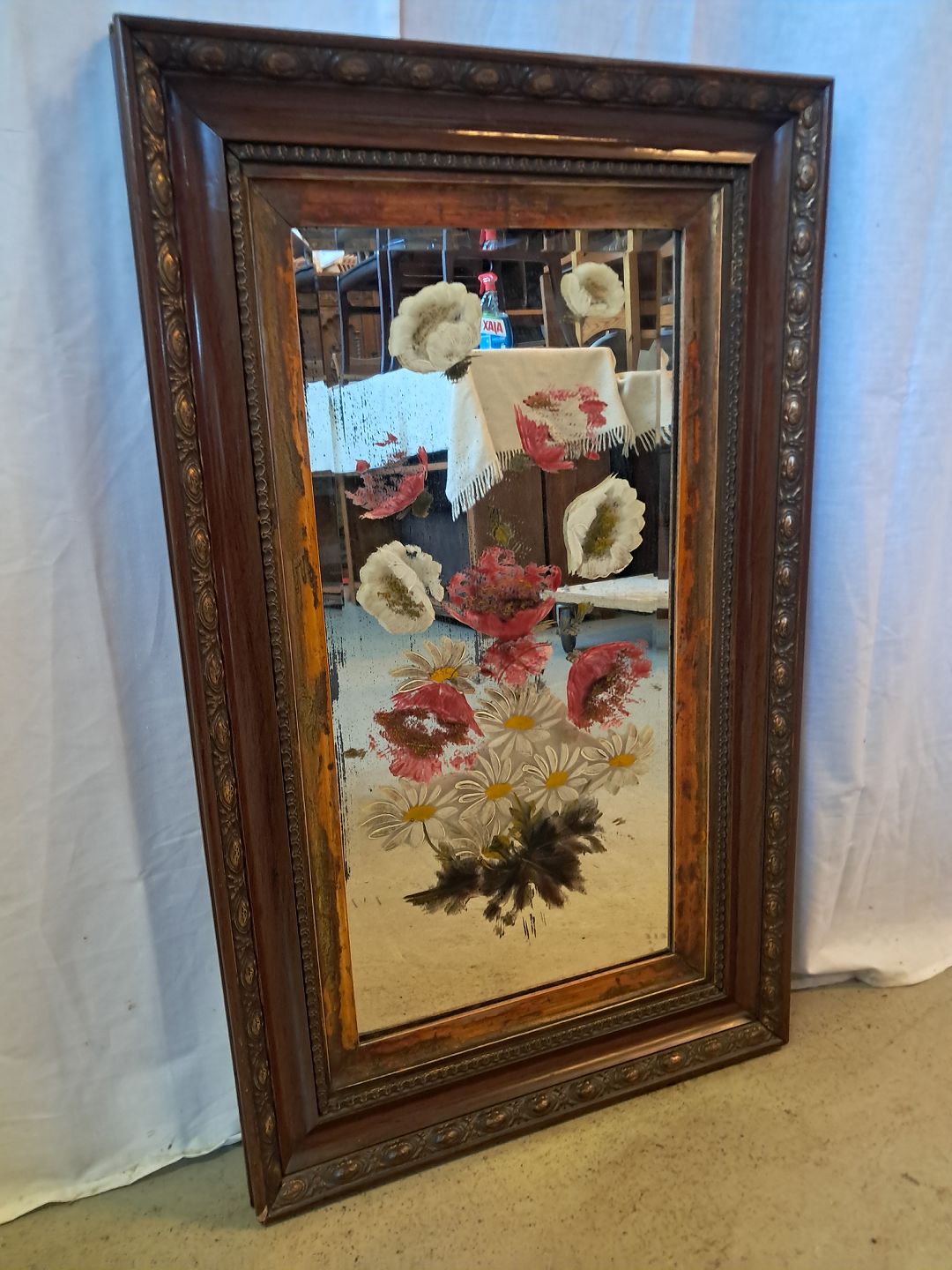 Spejl med påmalet blomster, fra 1920erne. Det har brugsspor. Højde 79cm Bredde 48cm Emne nummer: 77490