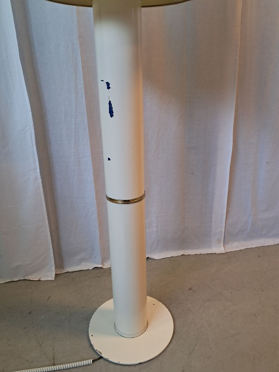 Standerlampe i metal og plast, fra 1980erne. Den har brugsspor. Højde 157cm Diameter på fod 33cm Diameter på skærm 45cm Emne nummer: 77512