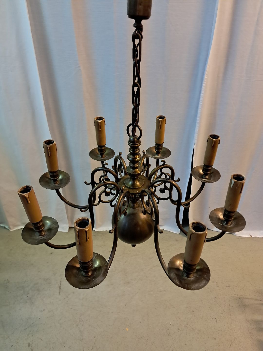 8-armet kirkekrone i bruneret messing, fra 1930erne. Den har brugsspor. Højde med kæde 70cm Diameter 59cm Emne nummer: 77600