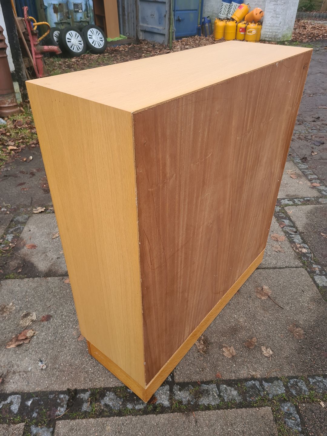 Reol i finéret eg med underskab og hessian beklædt bagbeklædning. Ydført hos HG Funiture i 1970'erne. Fremstår pæn og velholdt uden de store brugsspor.