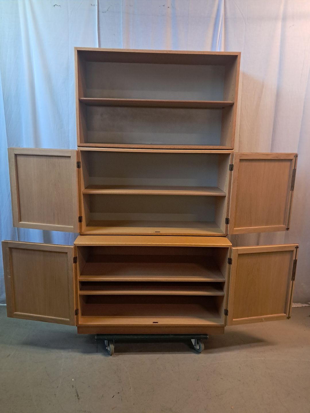 Børge Mogensen reol i fineret egetræ, fra 1970erne. Den består af 3 dele og har brugsspor. Højde 181cm Bredde 100cm Dybder 46cm og 32cm Emne nummer: 77669