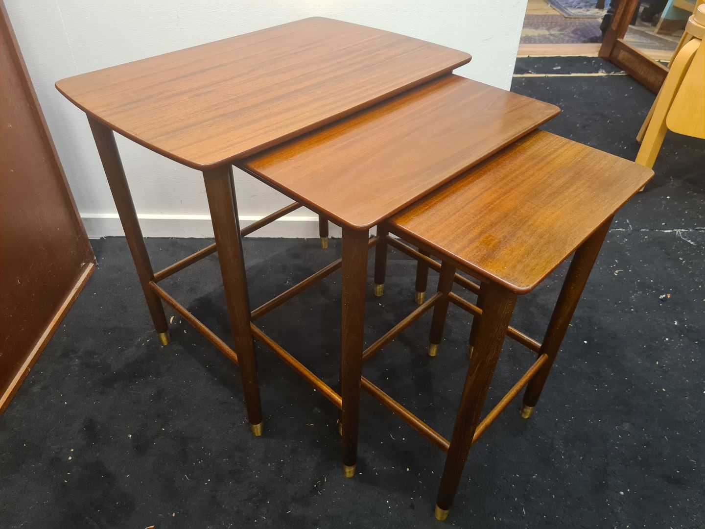 Dansk Design indskudsborde fra 1970'erne i mahogni og med messing sko. Fremstår pæne og velholdte uden nævneværdige brugsspor. Højde 53 cm. Bredde 54,5 cm. Dybde 37 cm. Emne nummer: 80916