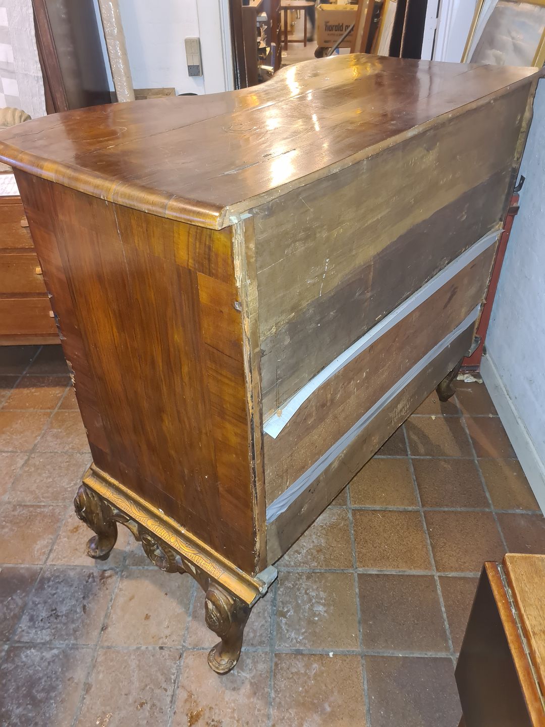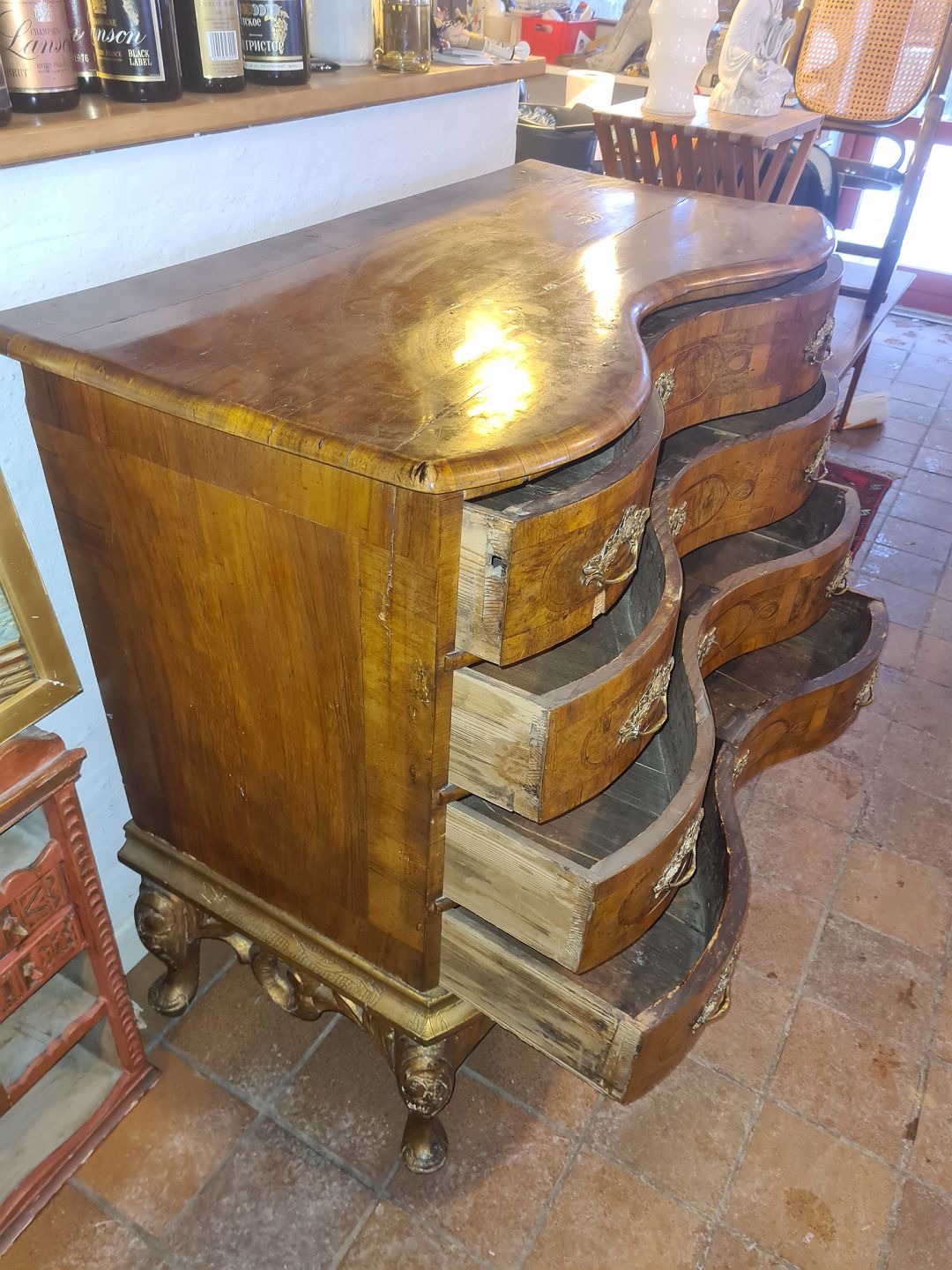 Rokoko dragkiste udført i delvis fineret mahogni og nøddetræ. Udført ca. 1820. Nb. nøgle med følger ikke. Brugt stand, fremstår med diverse finer afslag, ridser og mærker. Mål: H. 105 cm. B. 112 cm. D. 58 cm. Emne nummer: 81004