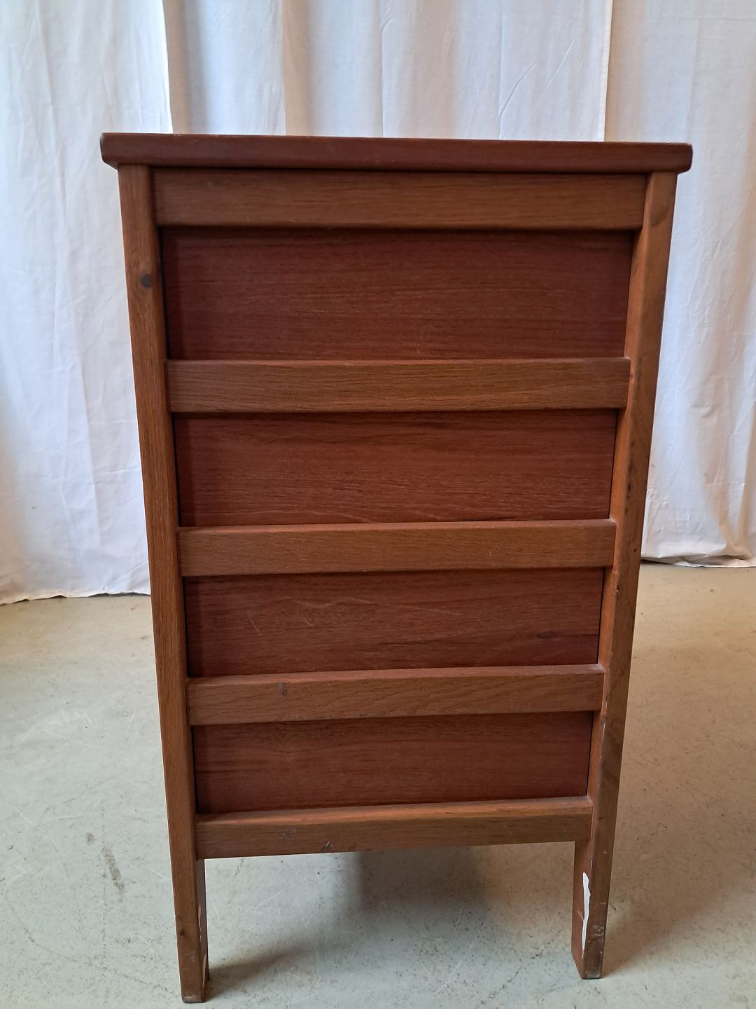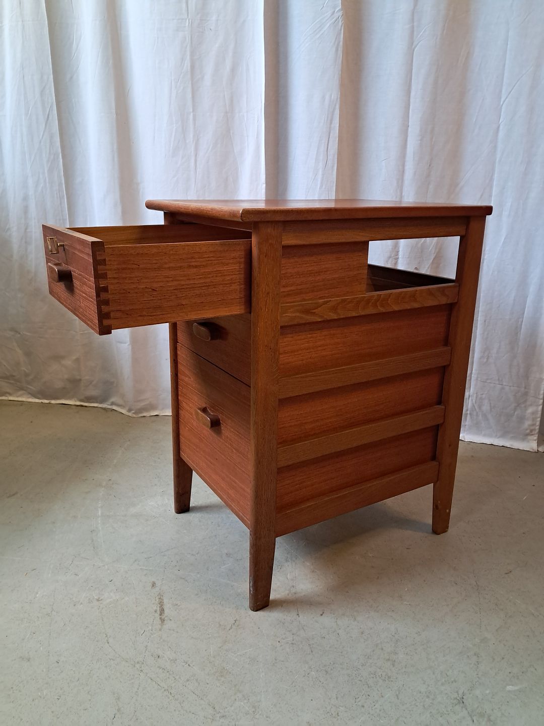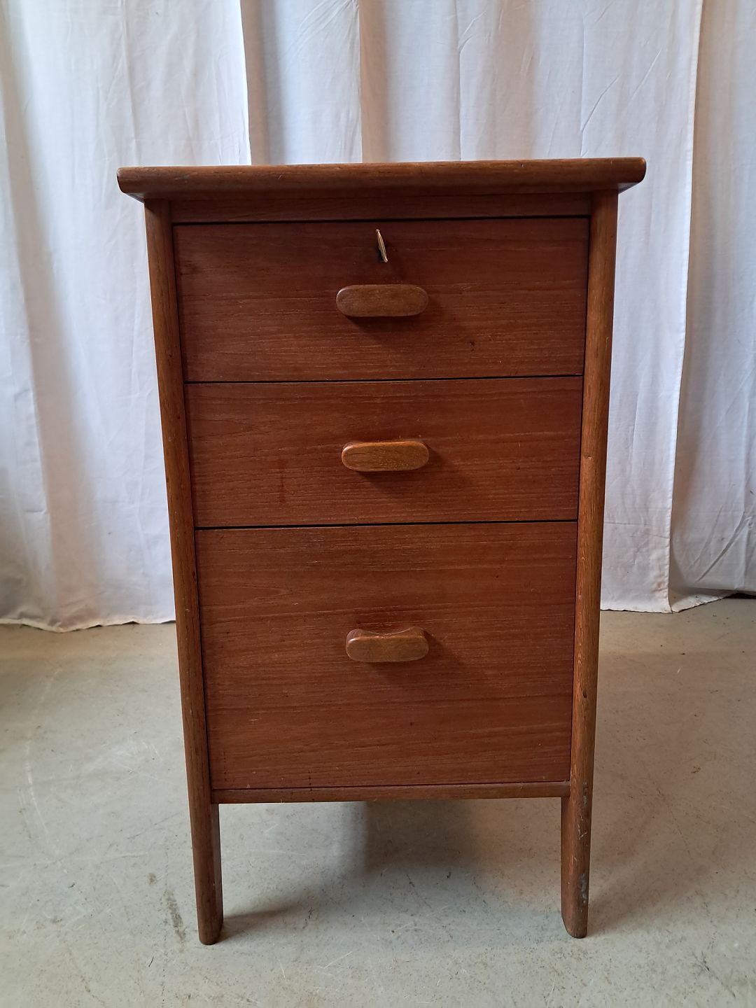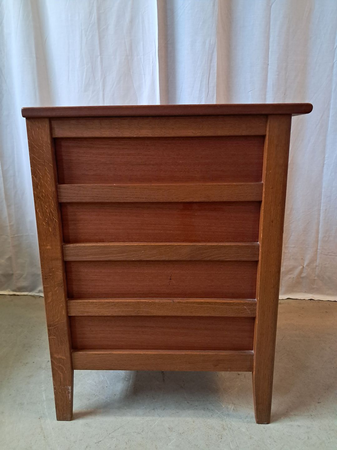 Kommode i massivt egetræ og fineret teaktræ, fra 19670erne. Den har brugsspor. Højde 75cm Bredde 42cm Dybde 58cm Emne nummer: 77800