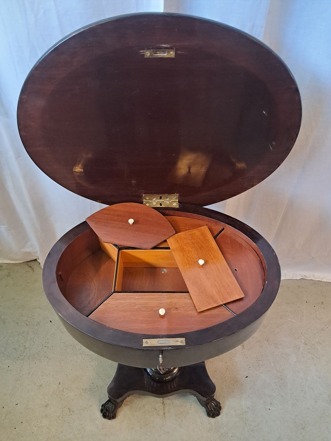 Søjlebord i fineret mahogni, fra 1910erne. Det har brugsspor. Højde 73cm Bredde 57cm Dybde 43cm Emne nummer: 77875