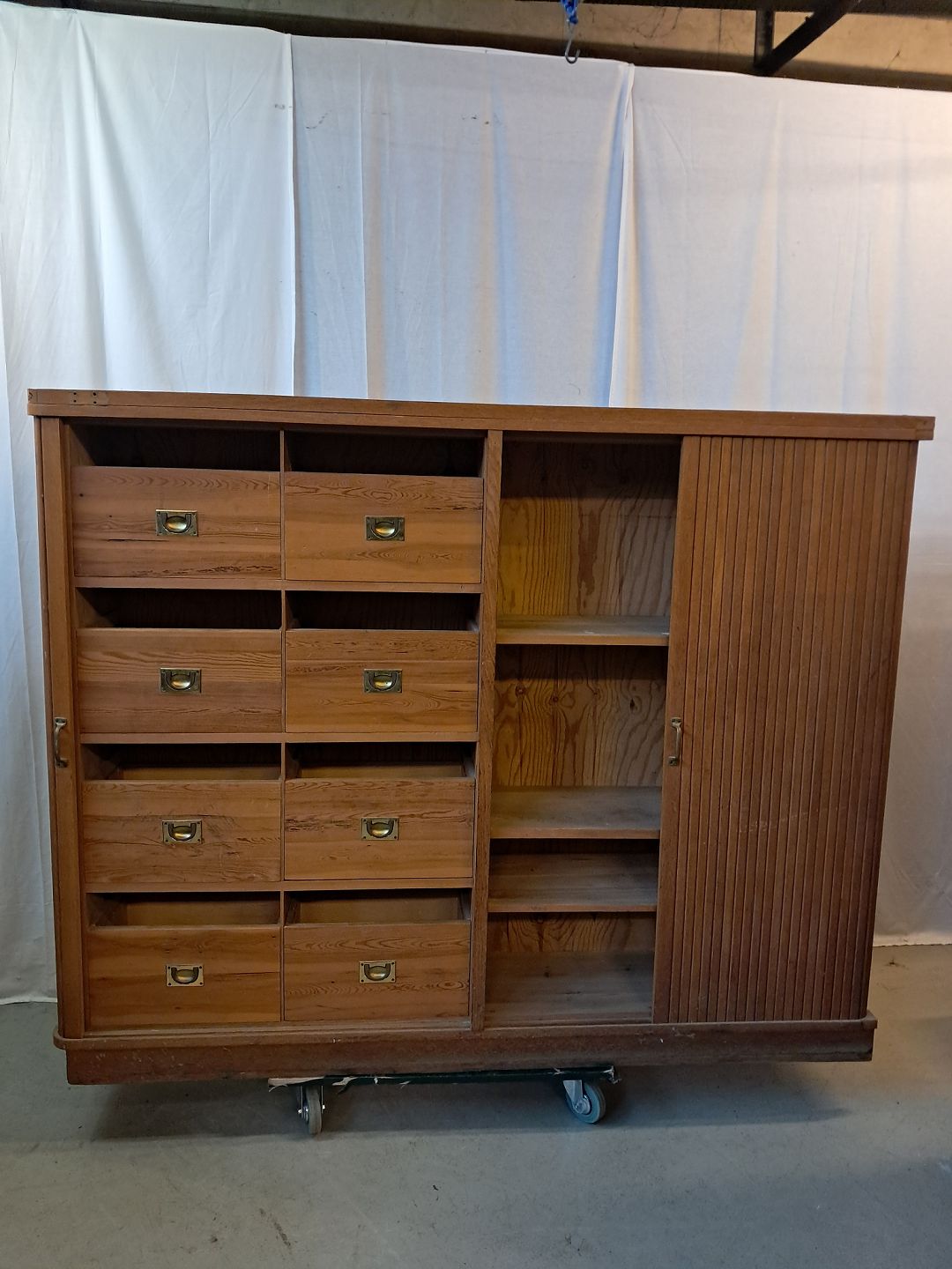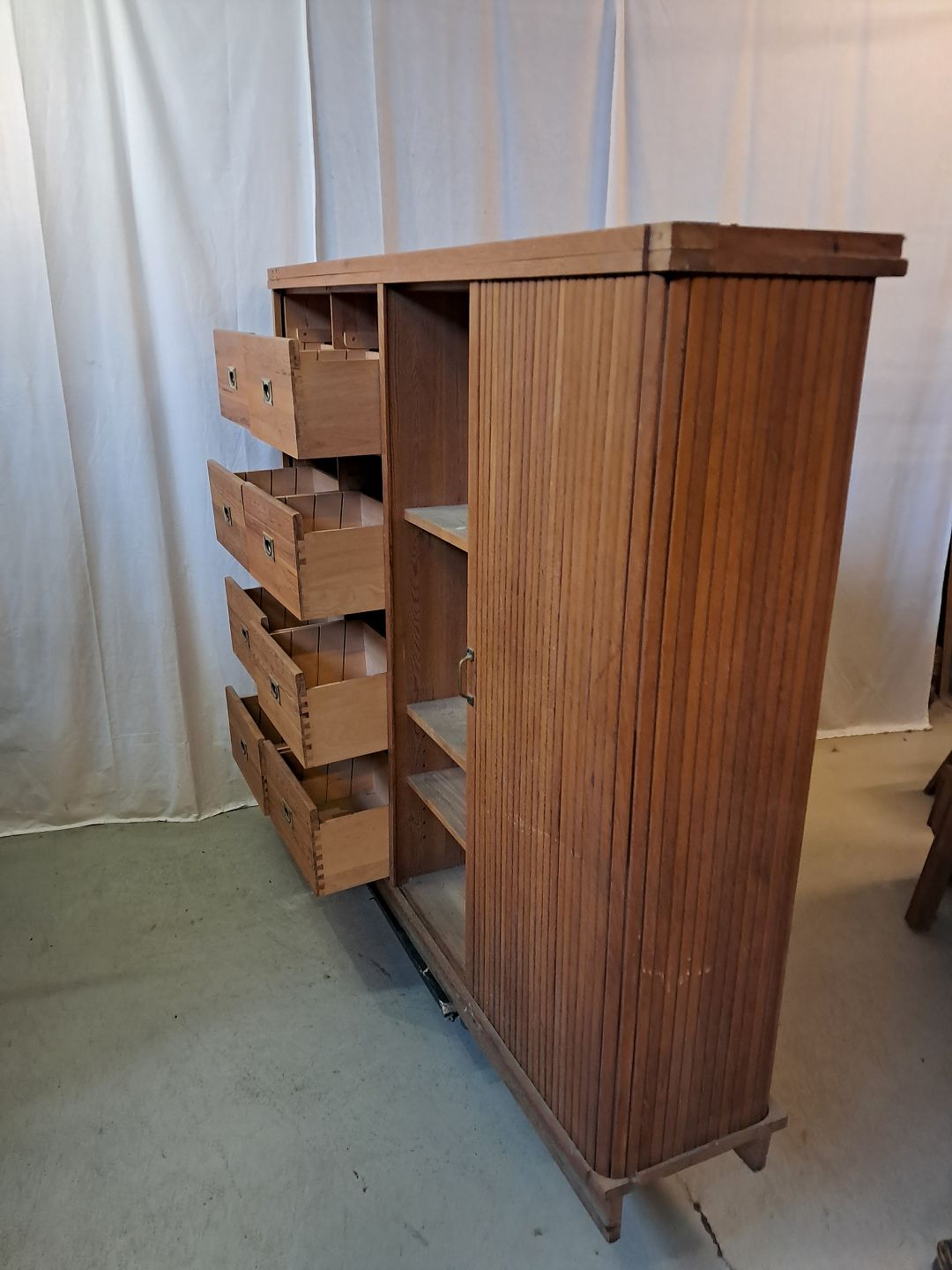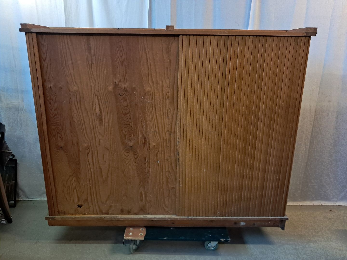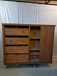 Jalousiskab i fineret egetræ, fra 1950erne. Det har brugsspor og defekte jalousilåge. Højde 142cm Bredde 180cm Dybde 35cm Se emne nr. 77814 og 77815 Emne nummer: 77884