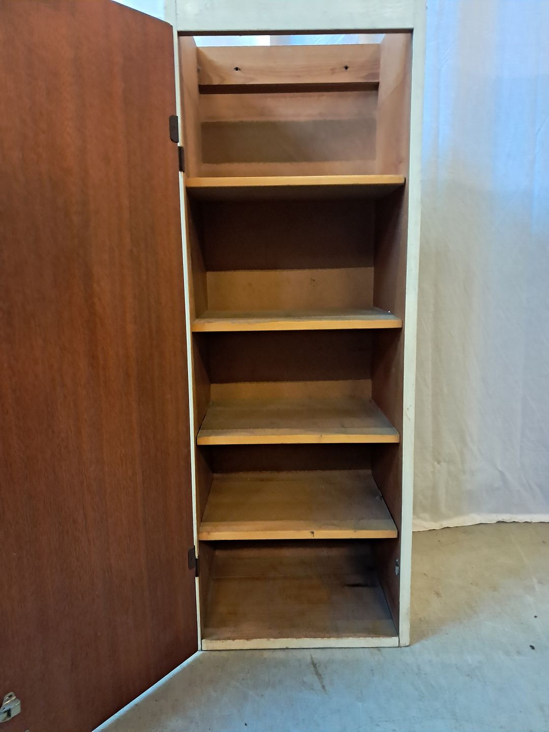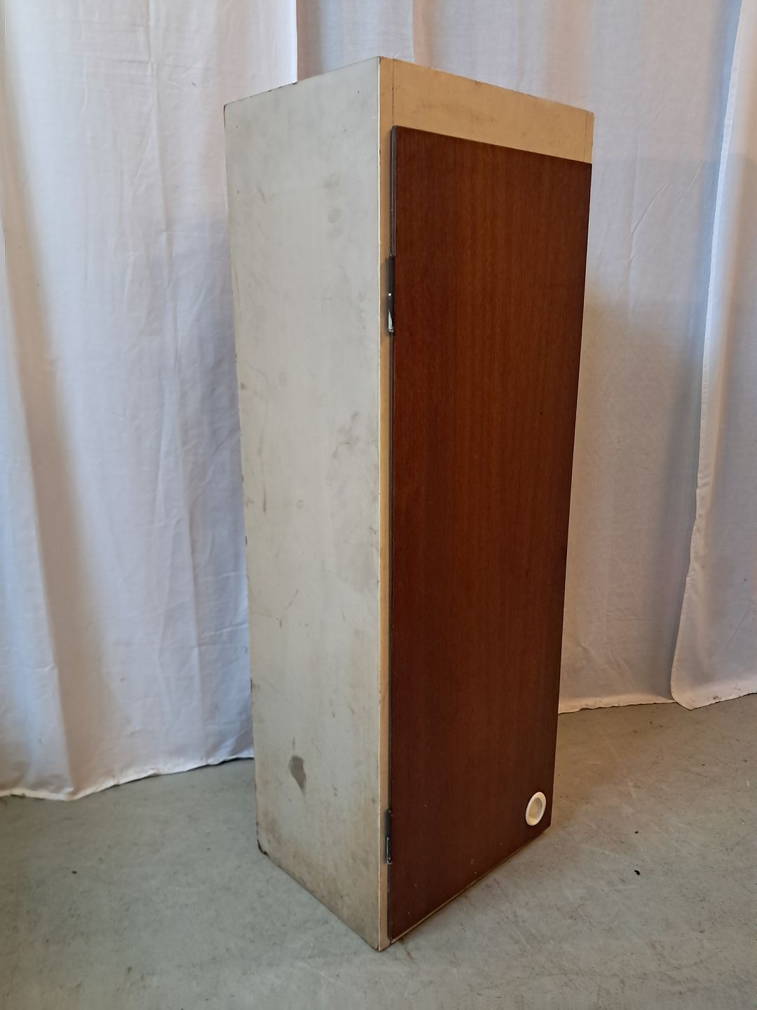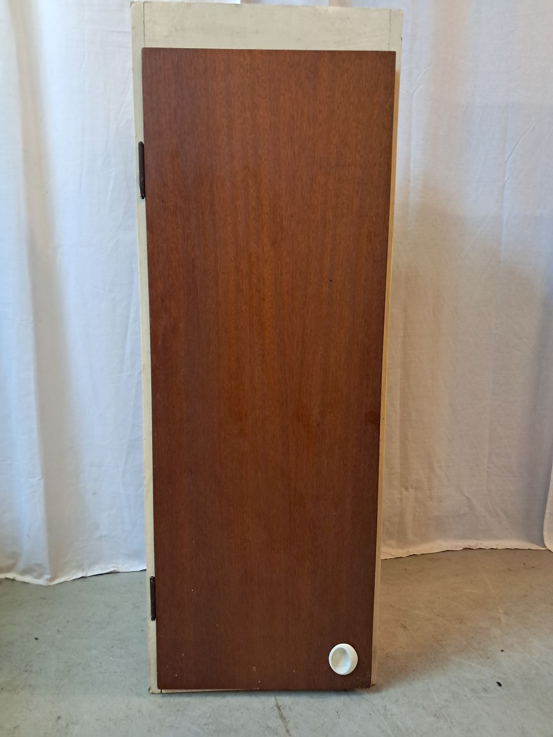 Gammelt malet køkkenskab med låge i fineret mahogni, fra 1950erne. Det trænger til at blive peppet op. Højde 112cm Bredde 40cm Dybde 29cm Emne nummer: 77889