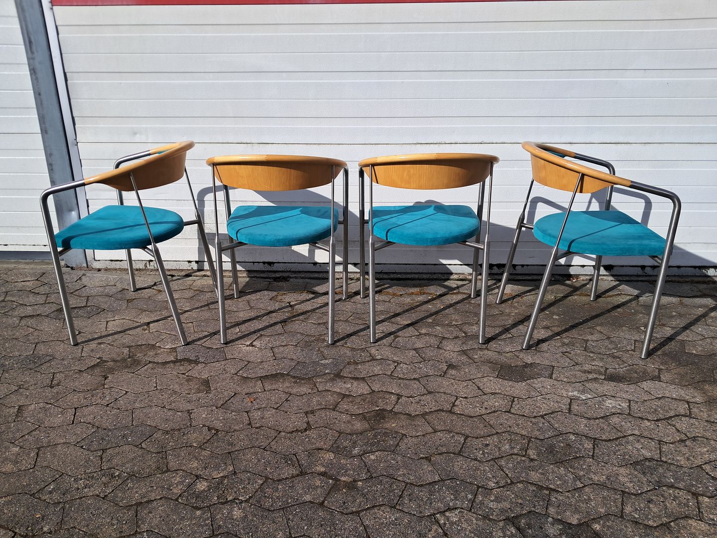 4 Chairman stole af Henrik Tengler i metal med turkis stofbetræk, fra 2000erne. De har brugsspor. Ryghøjde 76cm Sædehøjde 44cm Emne nummer: 77925