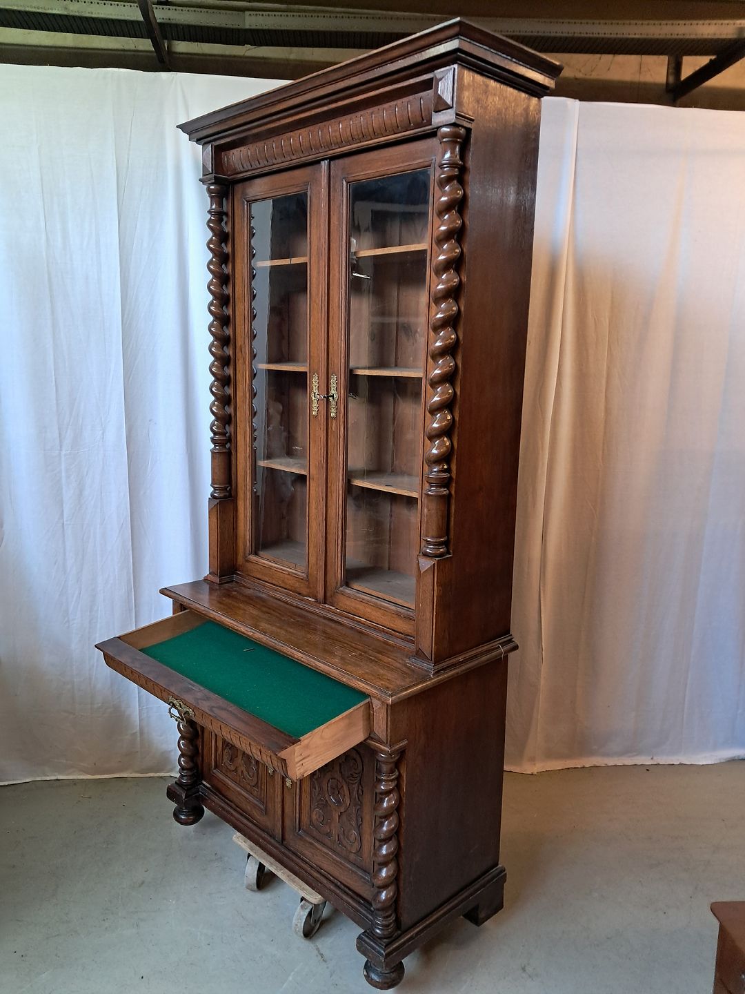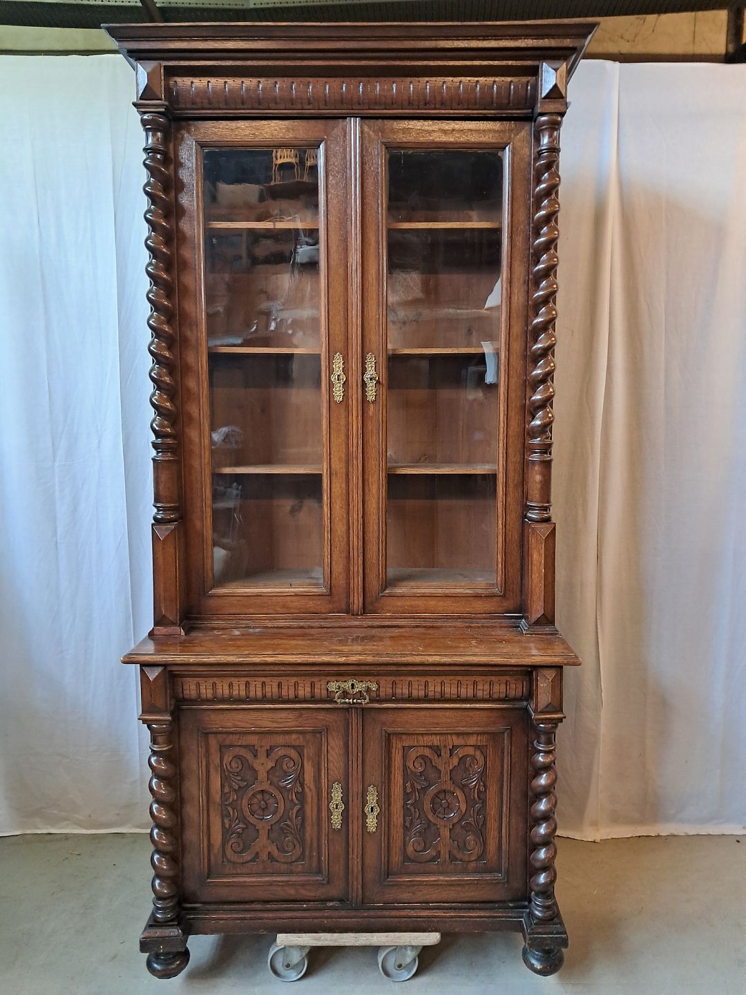 Skab med vitrineoverdel i massivt og fineret egetræ, fra 1900erne. De har brugsspor og mangler et par lister. (se foto) Højde 220cm Bredde 105cm Dybder 48cm og 25cm Emne nummer: 77940