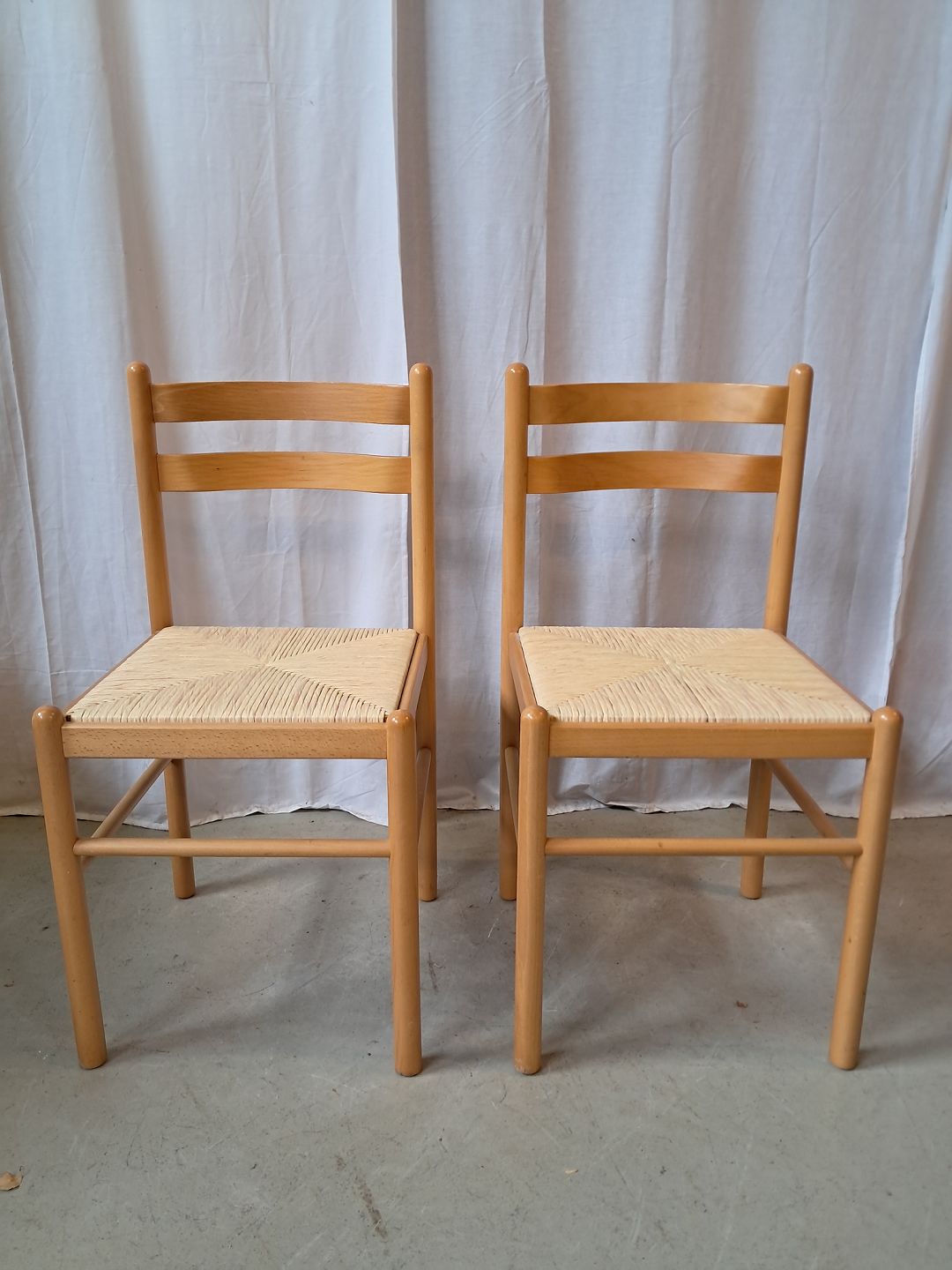 2 Stole i massivt bøgetræ med sæde af sivflet, fra 2000erne. De har brugsspor. Ryghøjde 82cm Sædehøjde 45cm Emne nummer: 77941