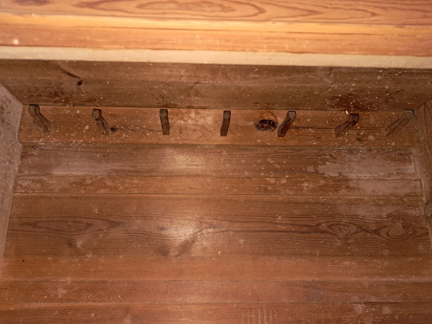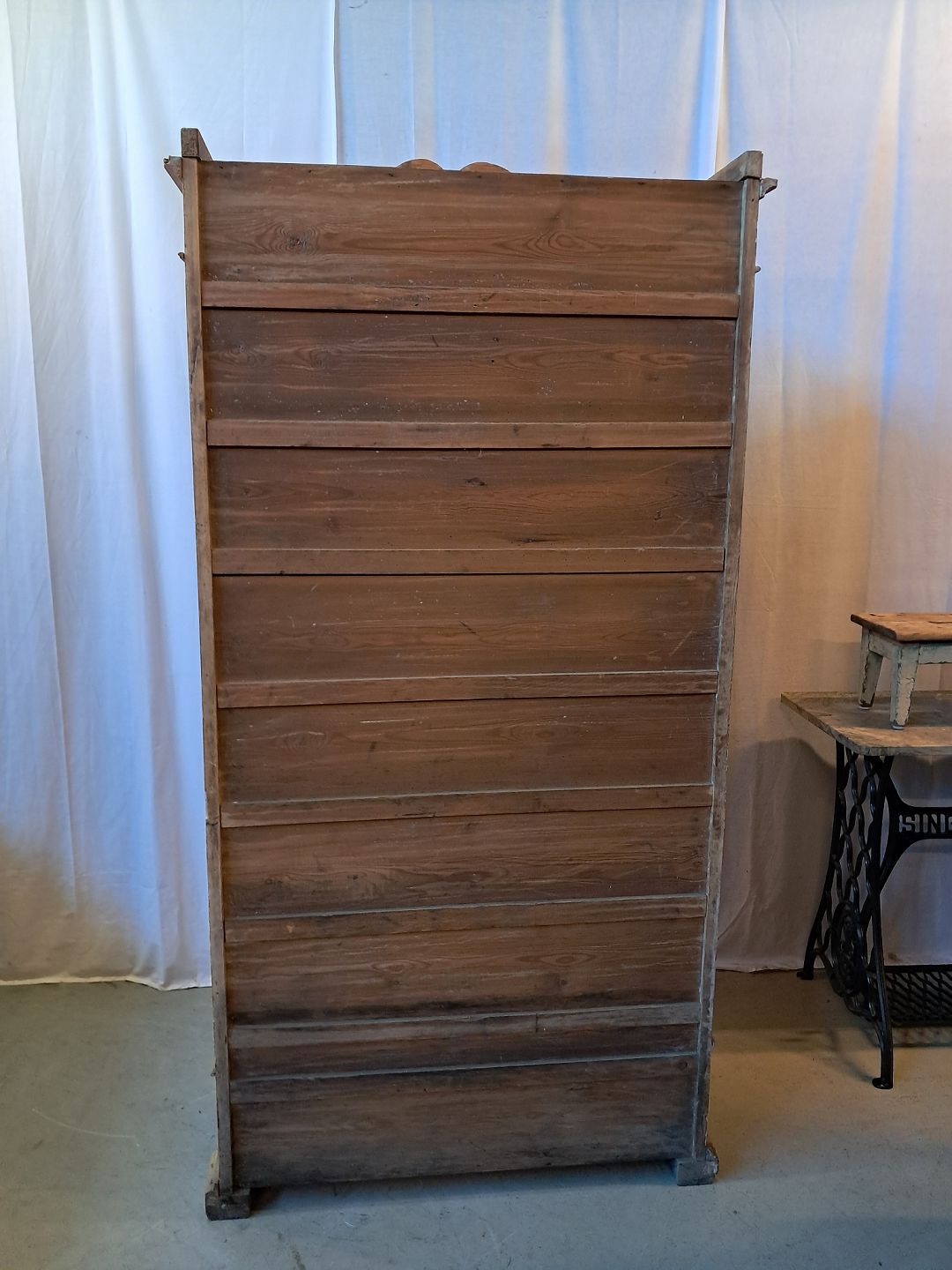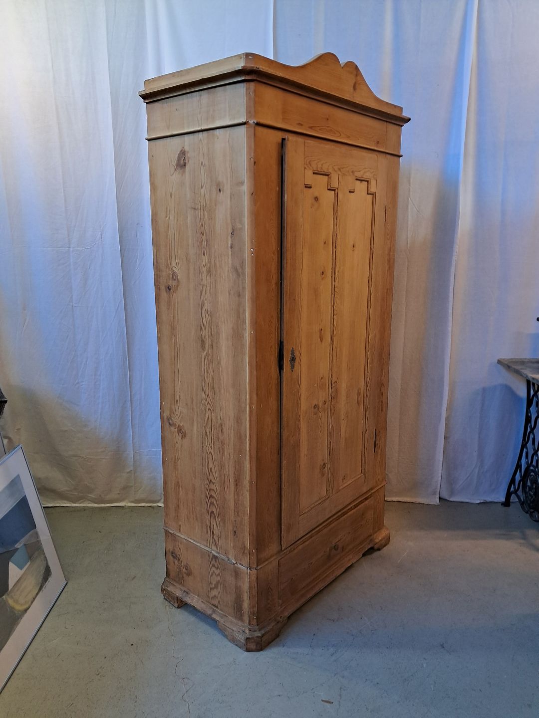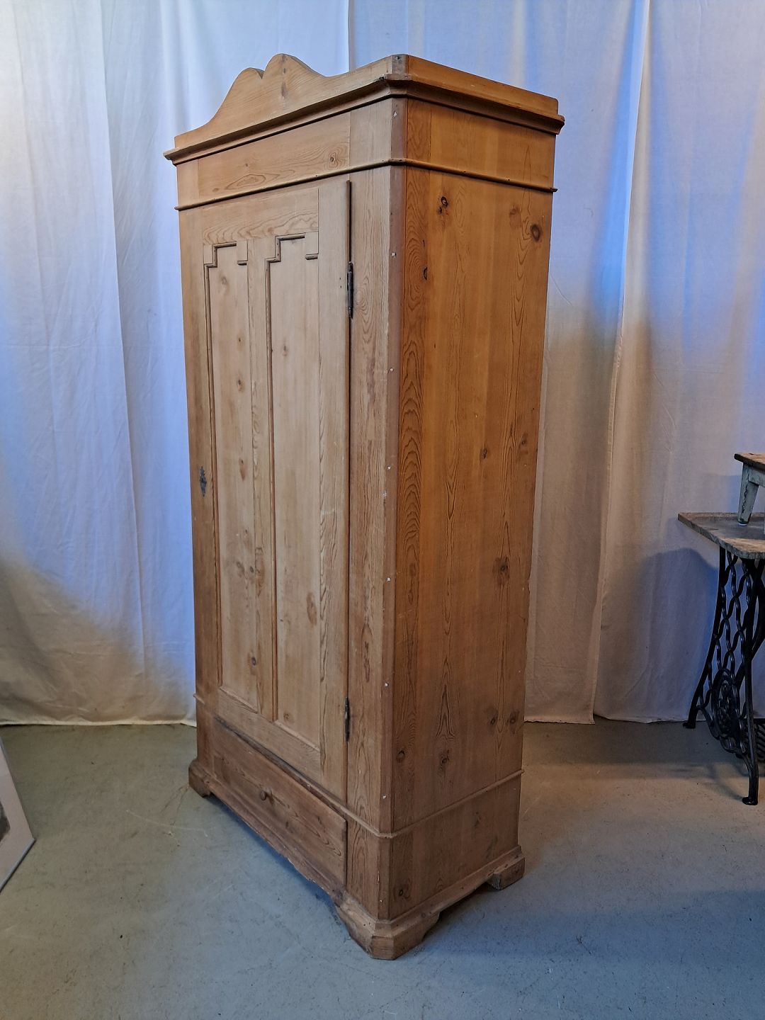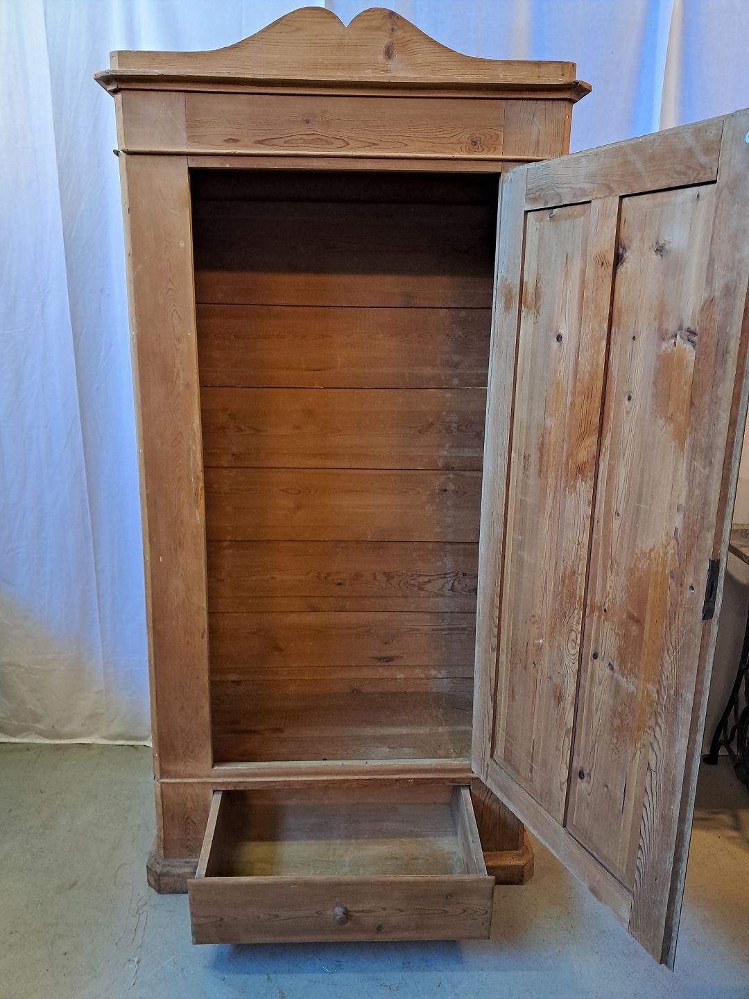 Skab i massivt fyrretræ, fra 1910erne. Det har brugsspor og defekte lister. Højde 183cm Bredde 92cm Dybde 45cm Emne nummer: 77961