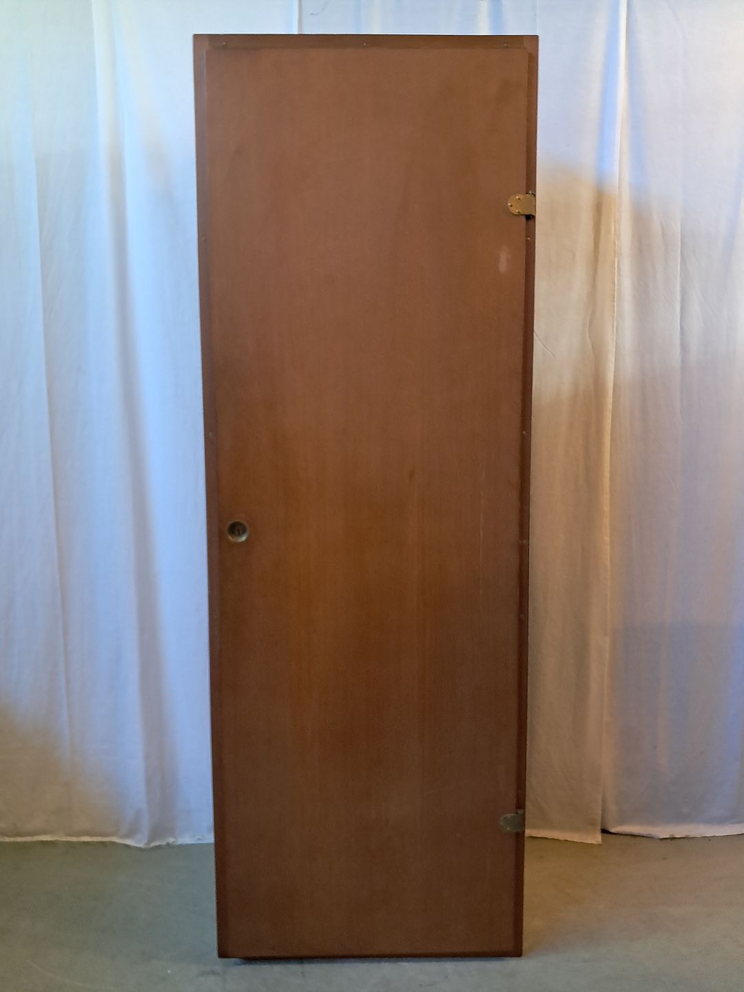 Boligens byggeskab fra 1960'erne med låge i Oregon pinem, designet af Børge Mogensen og Grethe Meyer. Det har brugsspor, og lågen ikke helt i, og der medfølger ikke sokkel. Højde 199cm. Bredde 69cm Dybde 39cm Emne nummer: 77984