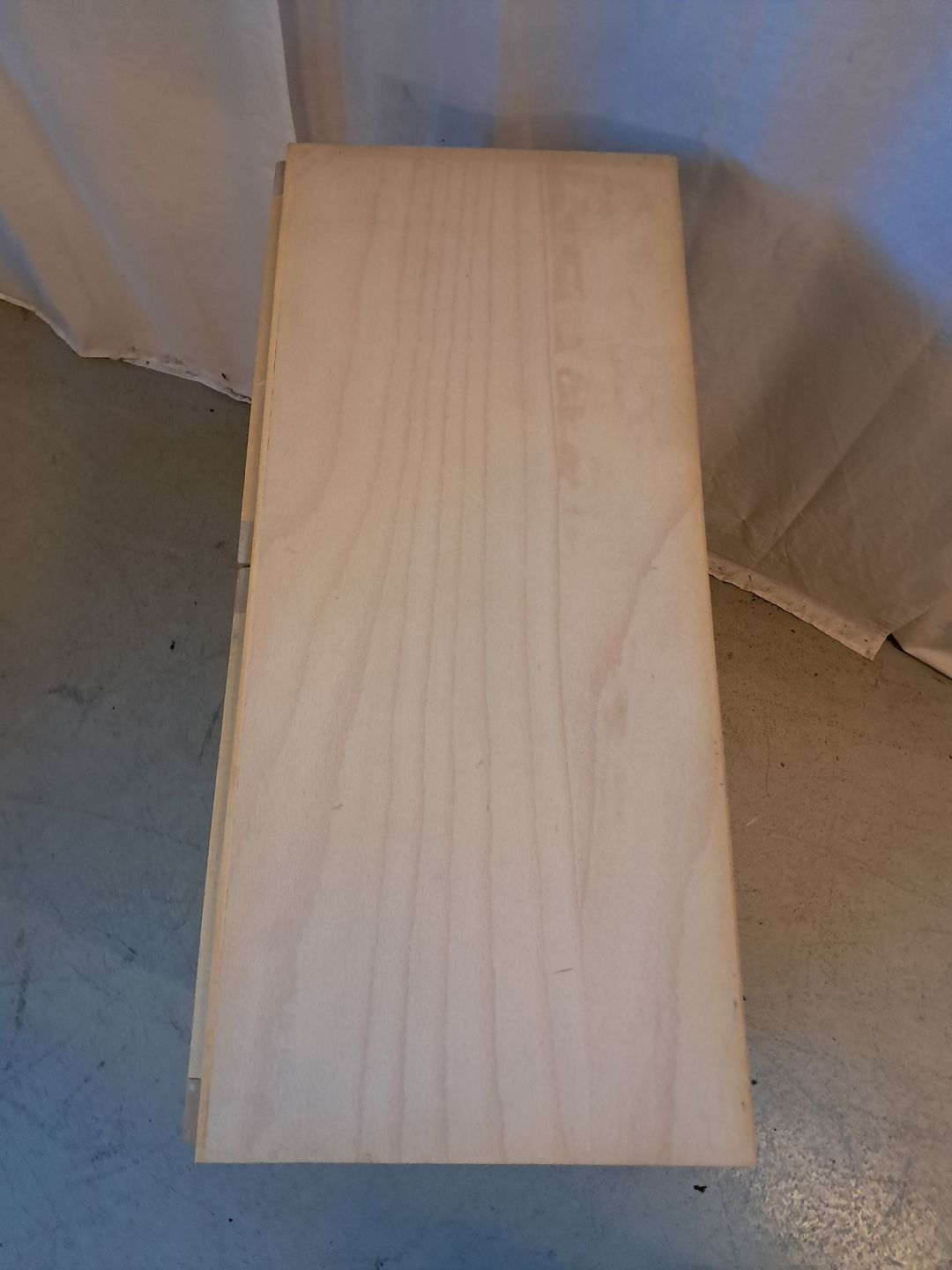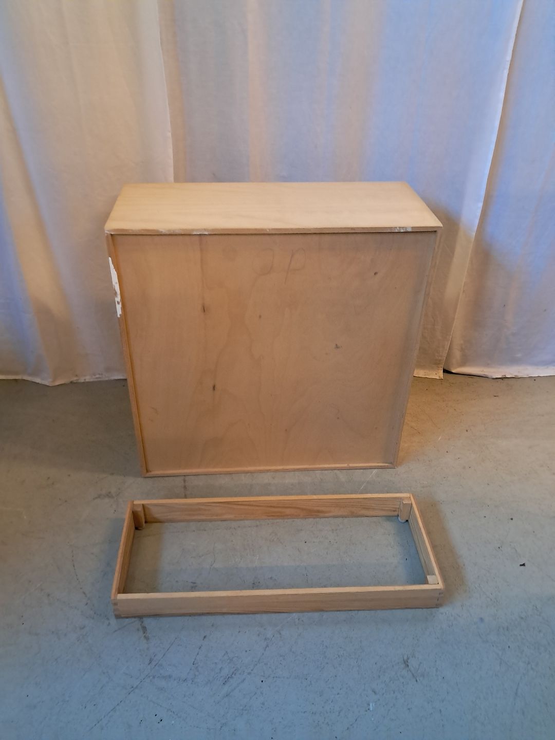 Skab i bøge krydsfiner, fra 2000erne. Det har brugsspor og gaber lidt i venstre hjørne.(se foto) Højde 70cm Bredde 70cm Dybde 30cm Sokkelhøjde 7cm Emne nummer: 77985