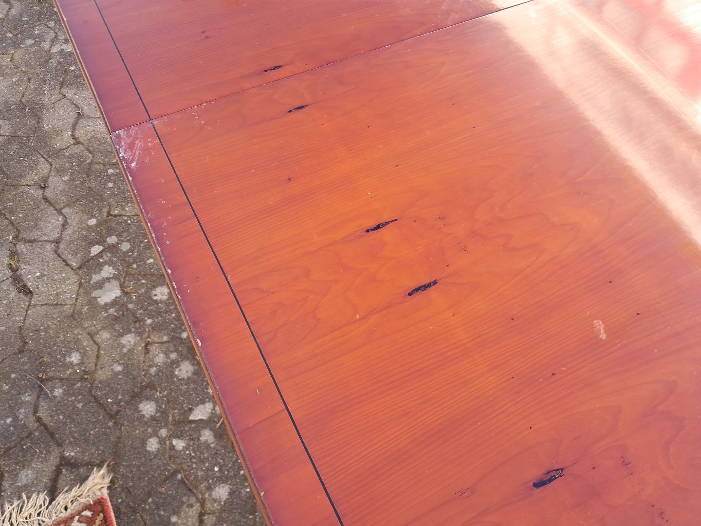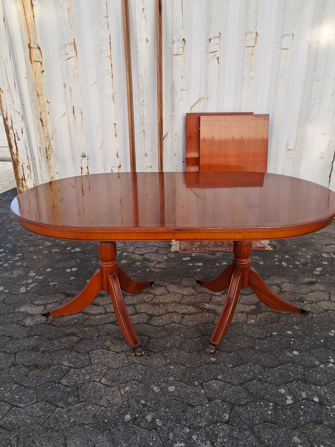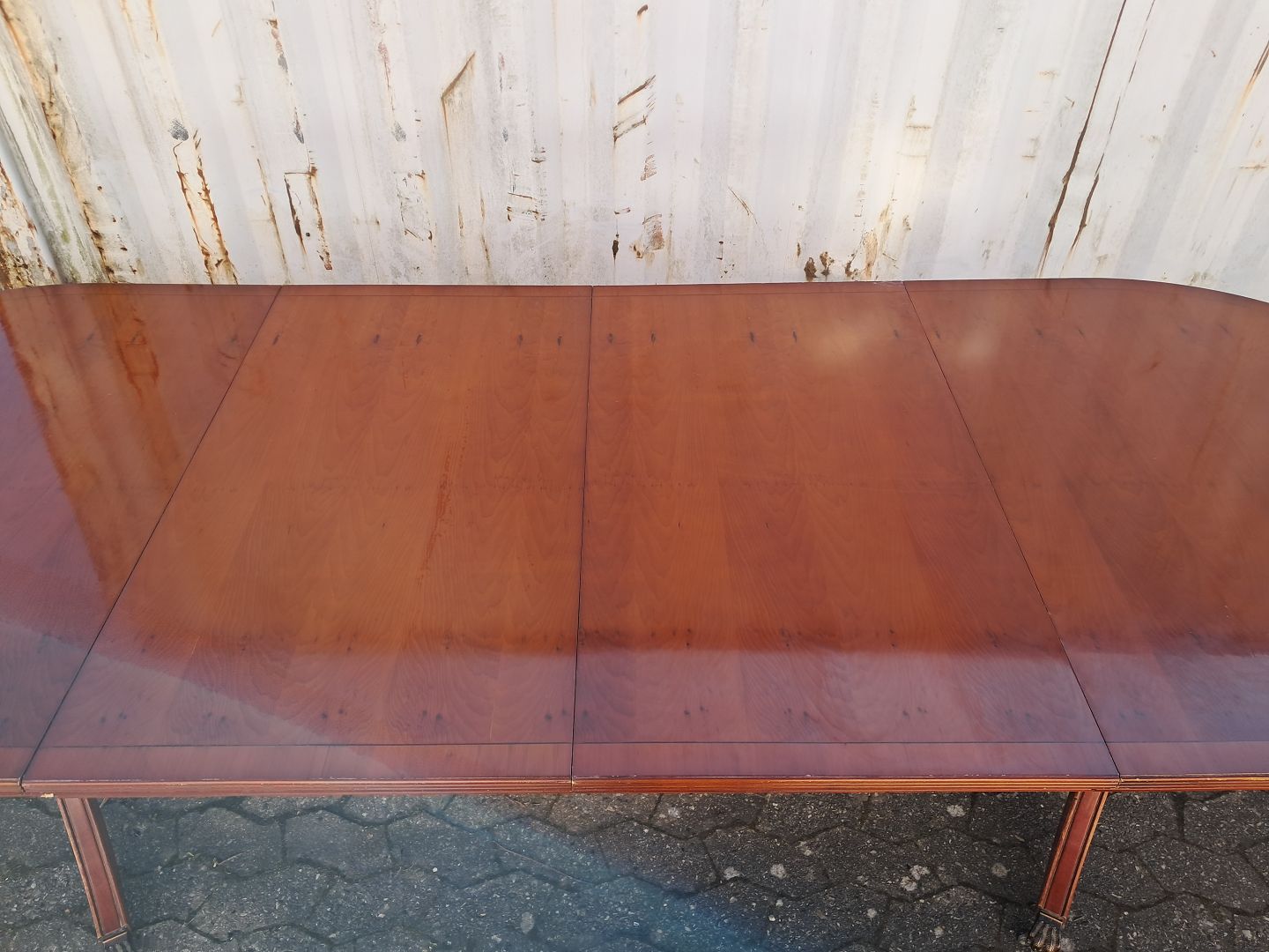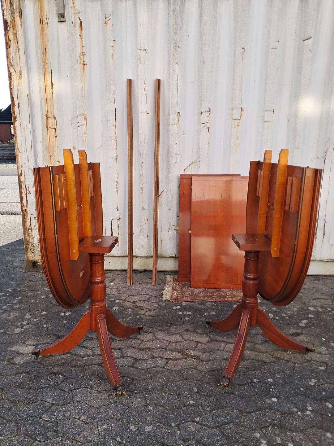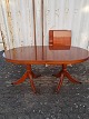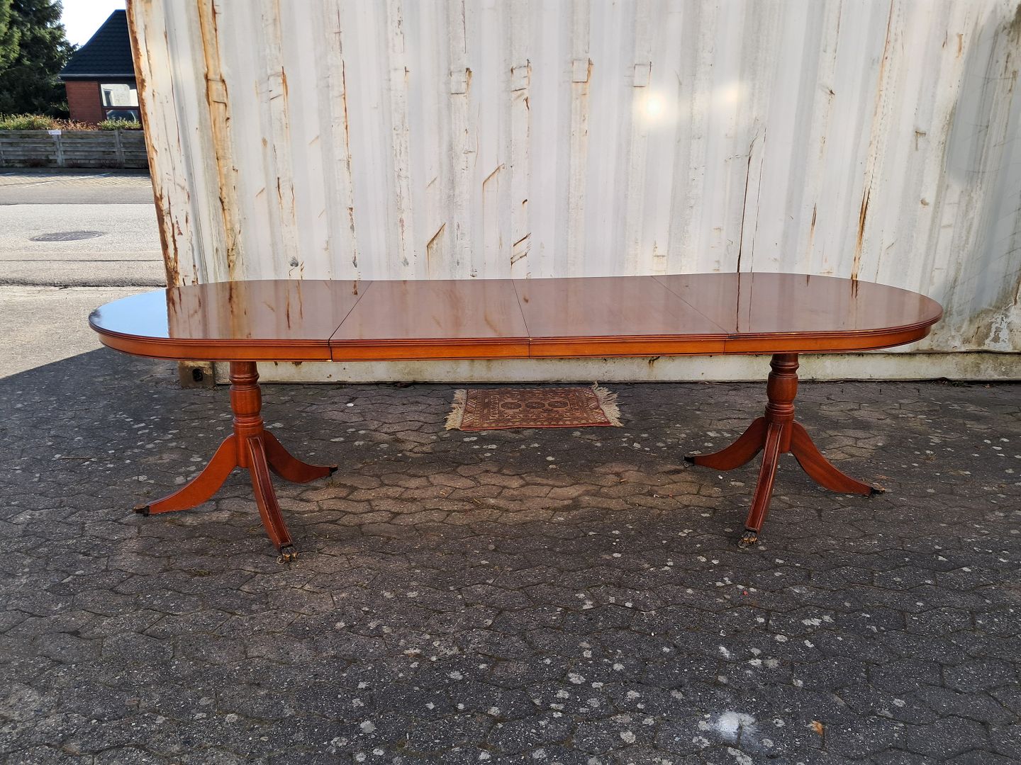 Two pillar table i fineret mahogni, fra 1990erne. Det har brugsspor og der medfølger 2 tillægsplader. Højde 76cm Bredde 100cm Længde 162cm Længde med tillægsplader 270cm Emne nummer: 77986