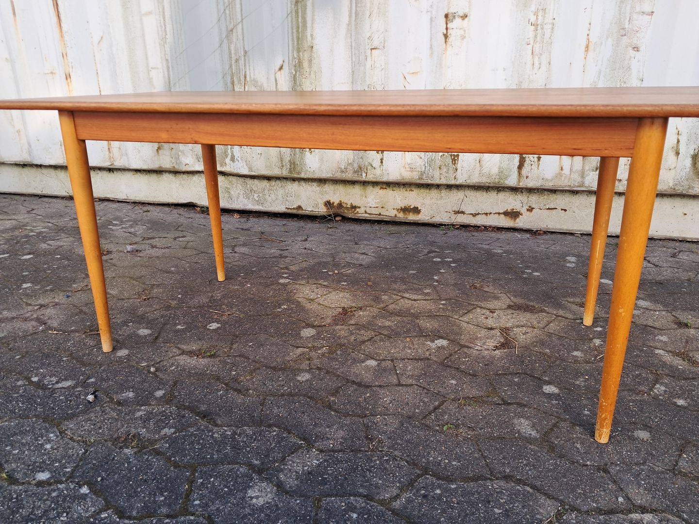 Sofabord i fineret teaktræ med ben i massivt bøgetræ, fra 1960erne. Bordpladen har brugsspor. Højde 52cm Bredde 55cm Længde 130cm Emne nummer: 77990