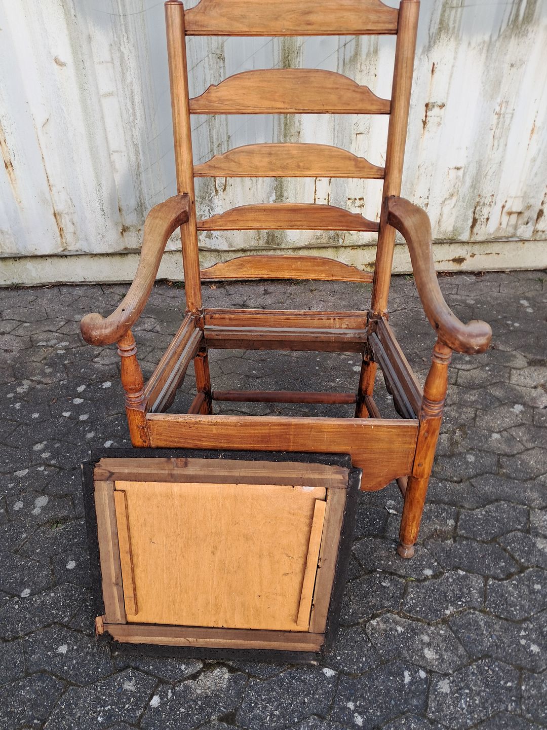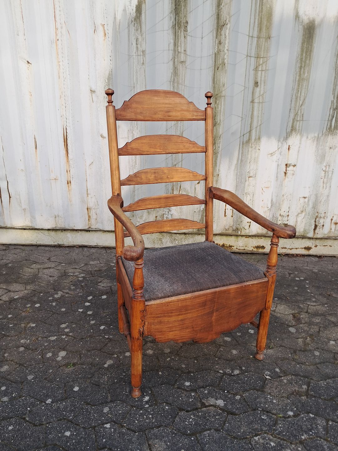 Gammel armstol i massivt træ, fra 1900erne. Den har brugsspor. Ryghøjde 124cm Bredde 75cm Dybde 47cm Sædehøjde 45cm Emne nummer: 77991